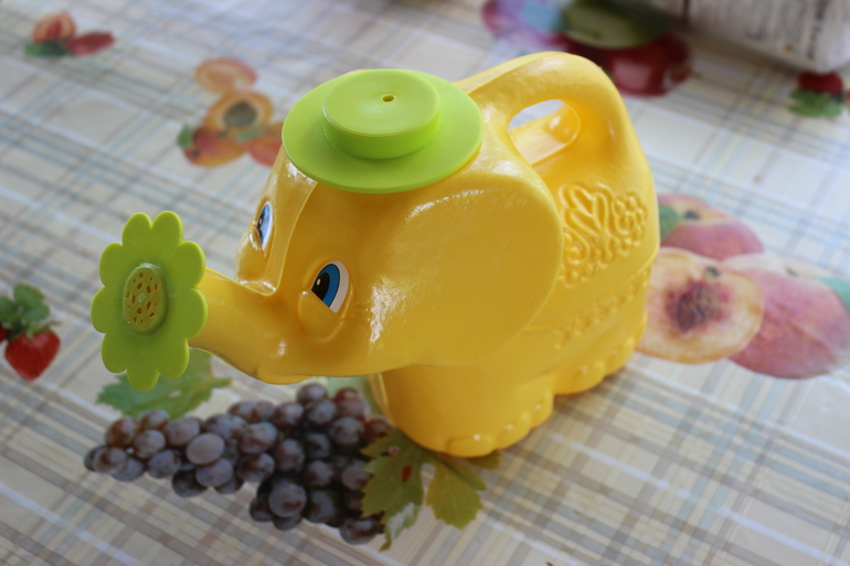 Лейка "Солнечный слоненок". Лейка очень приятная, из качественного мягкого пластика. Глазки приклеены, шляпка-крышечка из пластмассы, носик снимается. Купила на дачу, но решили взять с собой и на море.
