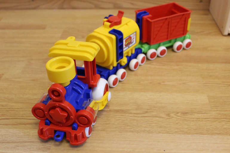 Паровозик "Ромашка" с двумя вагонами, Форма. Вот, о чем я жалею, так это о том, что не купила его раньше. Очень крупного размера, длина 53 см! Два вагона - грузовой и цистерна. У цистерны откидываются крышечки, у грузового вагона сзади открывается крышка и там хранится небольшая черная лопатка. В сам паровозик можно посадить человечка (входит в комплект). Как у настоящего старого паровоза, у него есть поршни, они подвижны, это очень круто. Сзади кабины есть колокольчик, но он пластмассовый, поэтому звука не имеет. Колеса, как у почти у всей техники от Формы резиновые, тяжелые и не убиваемые.