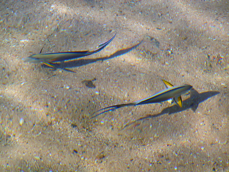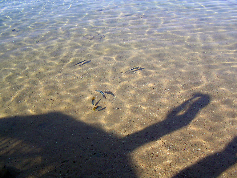 Песок несколько мусорный, подальше начинаются камни, покрытые какой-то серой мутью. Периодически подплывают вот такие рыбы: