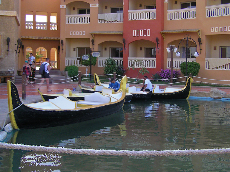 На территории отеля есть два канала, по которым можно кататься на лодках. Вот здесь причал с резиновыми лодками для самостоятельного плавания: