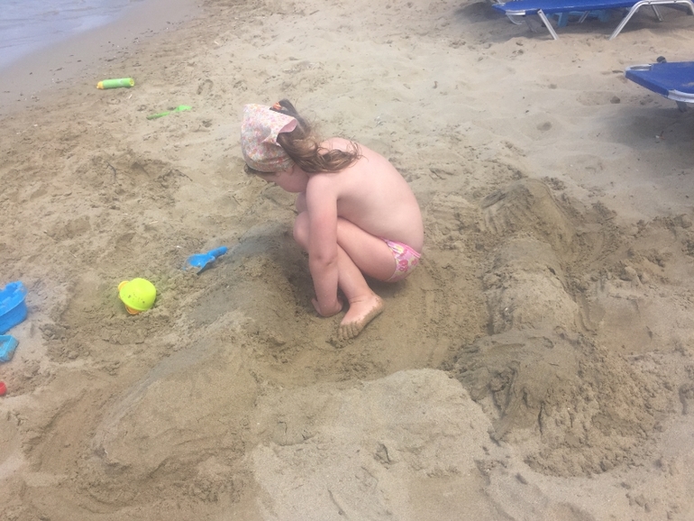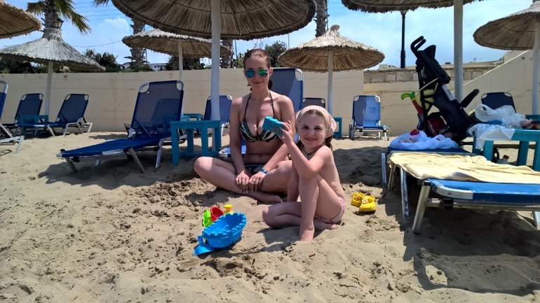 Первым делом привели ее на море, так как знала, что из бассейна ее не вытащить! Пляж очень удачный, немного портит вид волнорез, но потом я увидела пляжи без него с этим ветром-войти было невозможно! Так что хорошо, что он был, да и прыгать с него было весело)