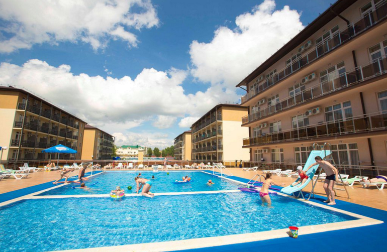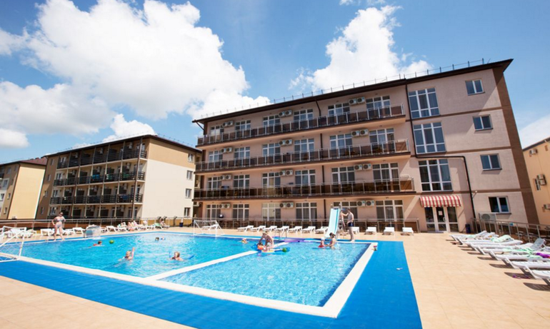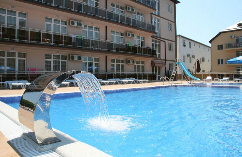 Отель все включено Анапа имеет обширную территорию, на которой расположен достаточно большой бассейн с очищенной безопасным способом водой. Бассейн поделен на зоны для взрослых, детей и зону гидромассажа. Так как вода в бассейне подогревается, Вы всегда будете чувствовать себя комфортно вне зависимости от температуры воздуха.