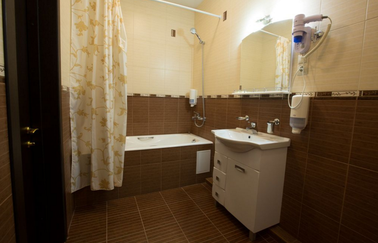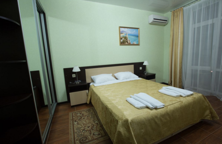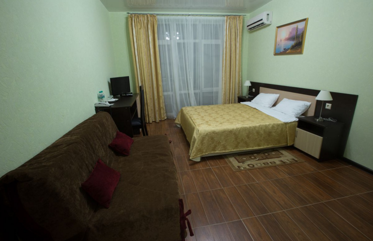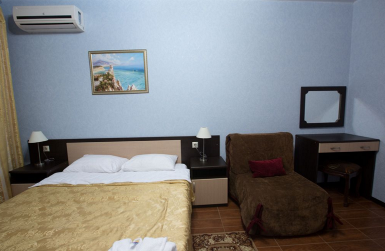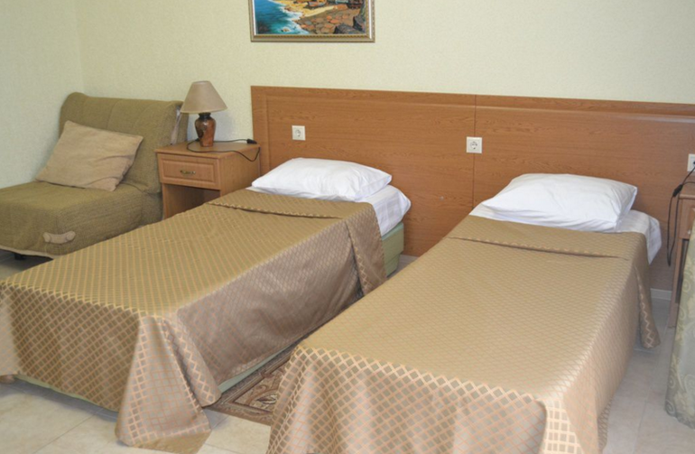2-х местный стандартный номер (19 кв.м). 15 номеров. В номере: раздельные кровати, кресло-кровать или диван, ТВ, мини-холодильник, сплит-система, телефон, сейф, фен, ванна, туалет, балкон. Возможно размещение 2-х человек на основных местах + 1 дополнительное место.