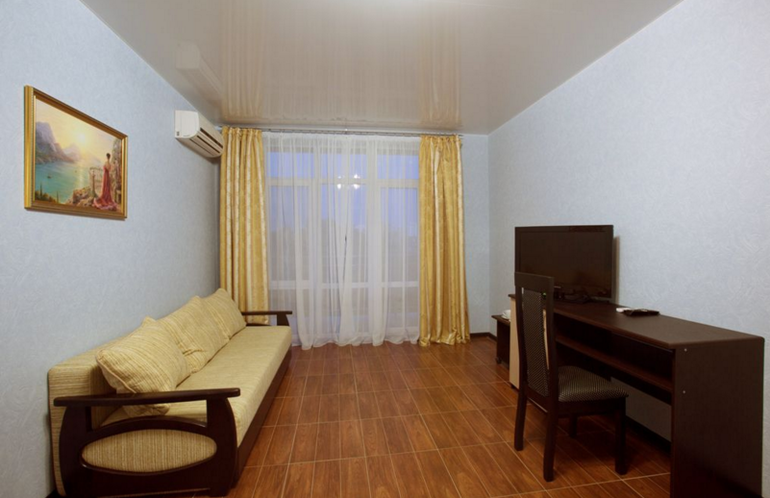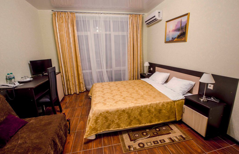 2-х местный стандартный номер (19 кв.м). 92 номера. В номере: двуспальная кровать, кресло-кровать или диван, ТВ, мини-бар, сплит-система, телефон, сейф, фен, ванна, туалет, балкон. Возможно размещение 2-х человек на основных местах + 1 дополнительное место.