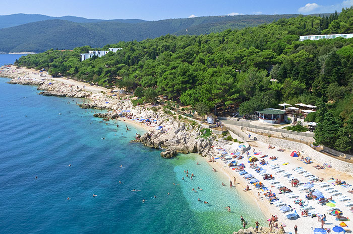 Пляж St. Andrea, награжденный «Голубым флагом», находится ниже церкви Sv. Andrija / Святого Андрея и променада до Рабца и удален на 100 метров от отеля Allegro / Аллегро. Пляж скалистый с оборудованными плато и галечными участками, а отличается кристально чистым морем и видом на залив Кварнер. До пляжа ведут ступеньки и дорожка, защищенная густой тенью сосен. На пляже предлагаются напрокат шезлонги и зонты, души и кабины для переодевания, а также широкий выбор водных видов спорта.