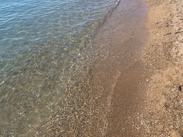 Песчано-галечный. Разделен на 2 части и имеется бассейн для малышат с морской водой под тентом.. Его прелестей не поняла. Мне он ( честно) не понравился.