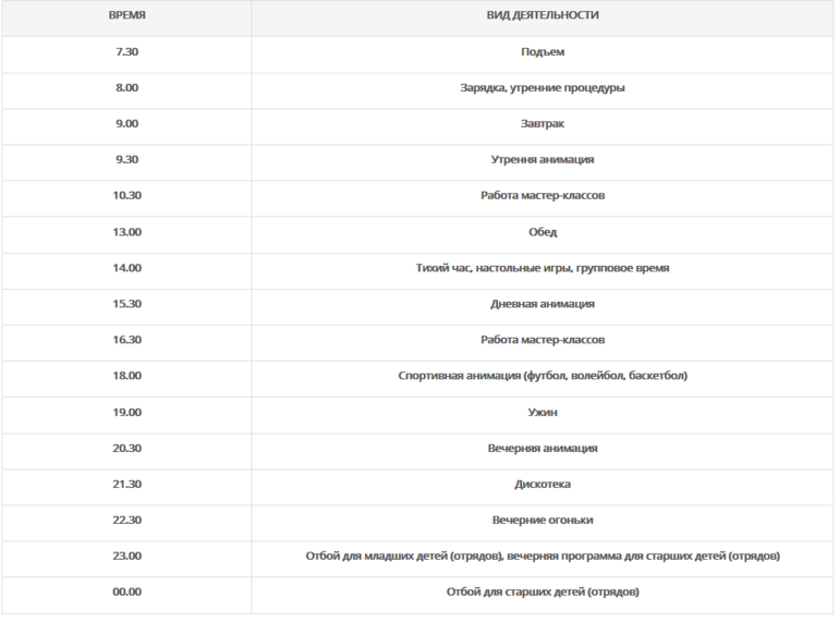 Утренняя зарядка, прогулки, спортивные состязания, участие в мастер-классах; |