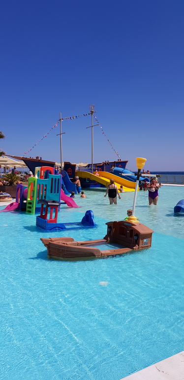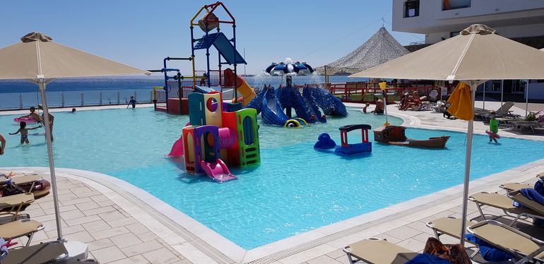 В детский бассейн некоторые родители своих детей пускали без купальных костюмов, т.е.голыми, несмотря на рекомендации даже принимать душ перед бассейном. Никто за этим не следит. Дети могли есть в бассейне, потом там мыть руки, лицо после еды, смывая её остатки. Видела как одна мамочка мыла лицо в детском бассейне своему ребенку, высмаркивая нос. Дети могли забежать в бассейн в обуви. За период нашего пребывания ни разу не видела чтобы его чистили. К концу нашего отдыха вода потемнела, а на дне образовались залежи песка и грязи. Каких-то более глобальных минусов больше не нашла.