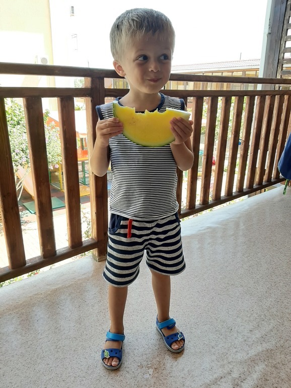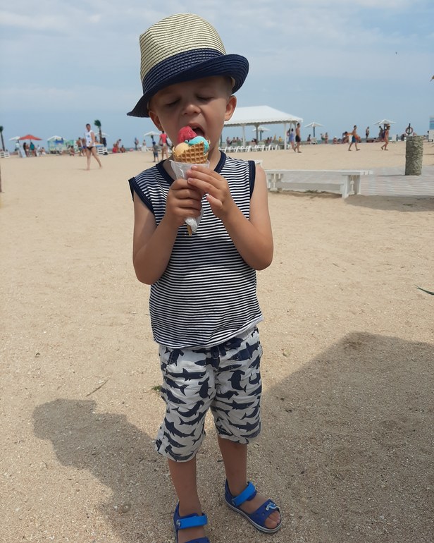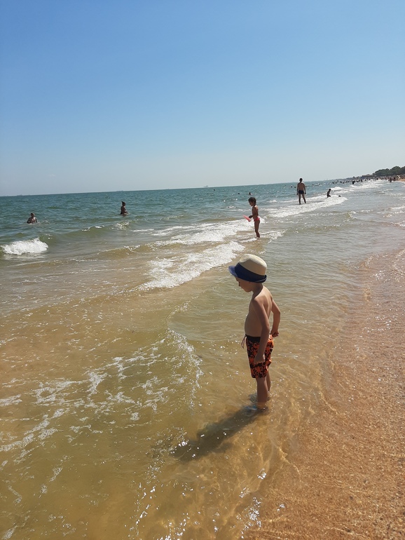 Протяжённость пляжа большая. Заход в море везде разный. По большей части достаточно мелко и долго идти до глубины. В одном месте правда было мелко, а потом сразу глубоко, ну как глубоко, Яру по пояс))) Море обычно с утра спокойное, может совсем небольшие волны, к обеду волны уже практически всегда. В том году Яр их боялся, а в этом наоборот понравилось и он расстраивался, когда их не было.