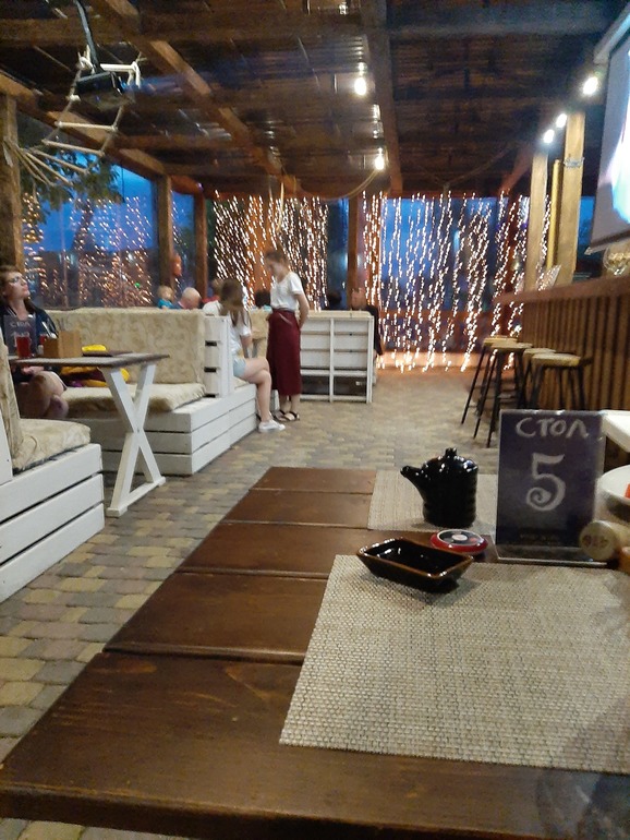 Кафе-ресторан, есть закрытая веранда, открытая и закрытое помещение. Курить можно только в одном месте на открытой веранде, больше вообще нигде! Очень для нас здорово, так как в большинстве кафе в Голубицкой запрет на курение не соблюдается, даже в детской пиццерии((