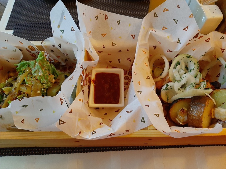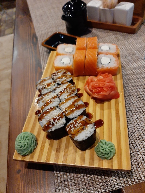 Мы в основном ужинали тоже в отеле. Во-первых удобно, номер рядом, кино показывают, ребенок наелся и побежал на площадку, которую видно с террасы, а во-вторых действительно вкусно. Меню какое хочешь: шашлык, пицца, суши (очень даже приличные).