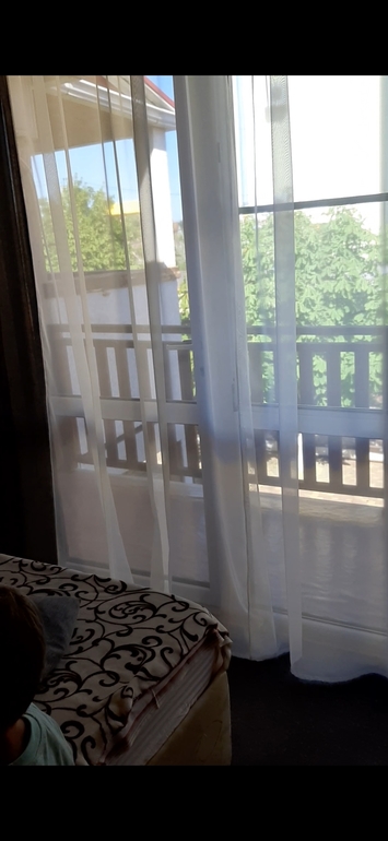 Двор не большой, но очень ухоженный. Наш номер был на втором этаже, окно во двор, точнее большой балкон. Номер новый, чистенький, светлый. Две кровати, две тумбочки, шкаф, телевизор, кондиционер, холодильник маленький, ну и (санузел) туалет, раковина, душевая кабина. Кстати в отеле никаких перебоев с водой не было, хороший напор и всегда была (читала много отзывов, что в Голубицкой проблемы с водой).
