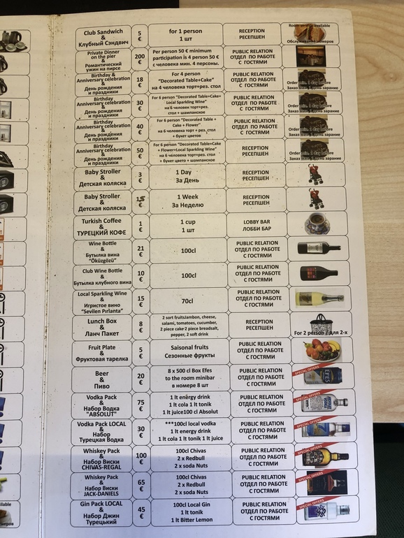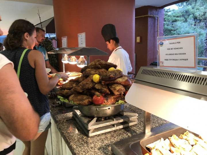 Напитки: чай турецкий, в пакетиках, кофе из автоматов нормальный, вино белое, красное, соки из автоматов (моя яблоко постоянно пила) и др газированные напитки в самообслуживании. Официанты только забирают и убирают со стола. Свежевыжатый апельсиновый по утрам 1 евро. Стакан большой, сок вкусный! Можно себе при желании позволить. Записывают чек на номер комнаты.