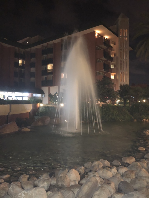 Вечером в этом месте поднимаются вверх несколько фонтанов, которые подсвечиваются. Сделать вечером качественное фото сложно. Поэтому фотографии дневные. И одно как получилось с фонтаном.