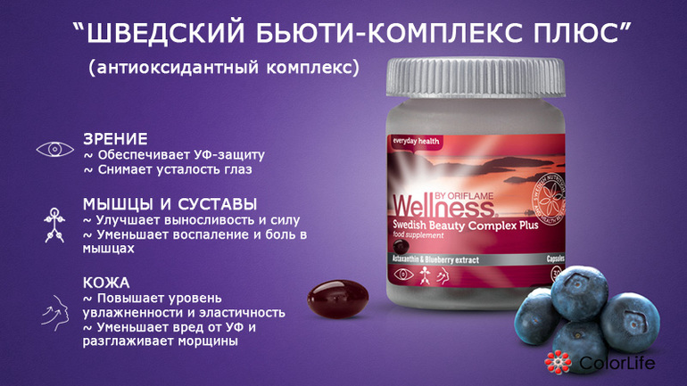 ПродуктыШведский бьюти-комплекс плюс содержит астаксантин - мощнейший антиоксидант на основе водорослей, добываемых у берегов Шведского архипелага и усилен экстрактом черники. Вместе они поддерживают естественную красоту и здоровье кожи, а также повышают мышечную силу и укрепляют сердечно-сосудистую систему. Не является лекарством. В одной капсуле шведского бьюти комплекса Орифлейм Wellness содержится 4 мг астаксантина, полученного из водорослей. Является биологически активной добавкой к оснонвному рациону пищи.