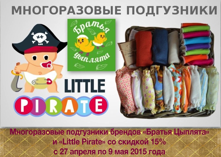 На 2 бренда многоразовых подгузников "Братья Цыплята" и "Little Pirate" СКИДКА 15 % БЕЗ ПРОМОКОДА. Только до 12 Мая!!!
