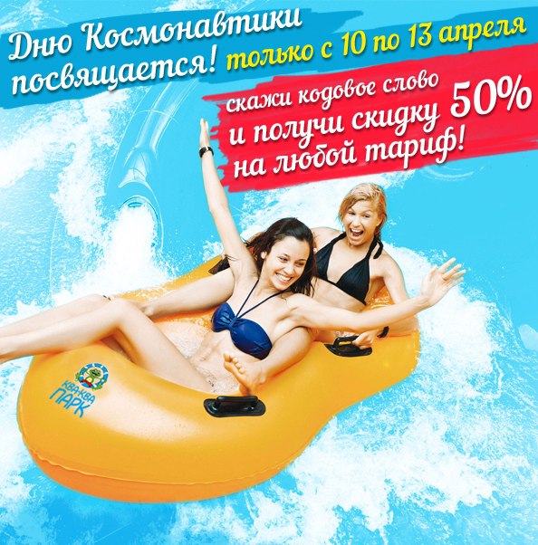 Только с 10 по 13 апреля 2017 г, в честь легендарного праздника, скажите на кассе аквапарка кодовую фразу: «Гордимся нашими космонавтами» и получите колоссальную 50% скидку на любой тариф.