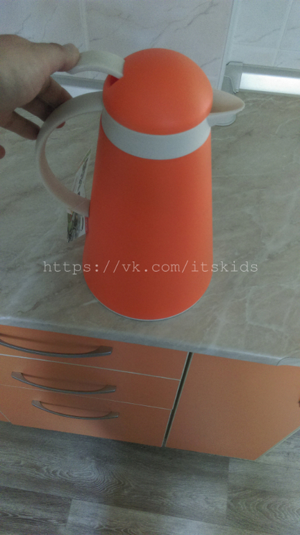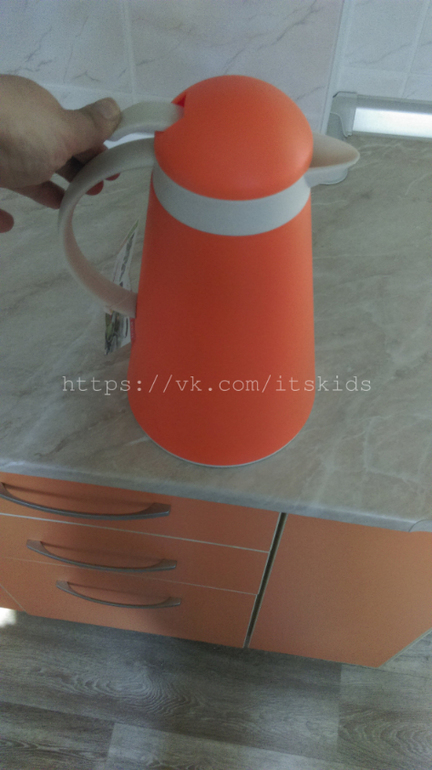 Корпус - пластик, колба стеклянная, на крышке рычажок, открывающий отверстие в носике (можно наливать чай или отвар, не отворачивая крышки).