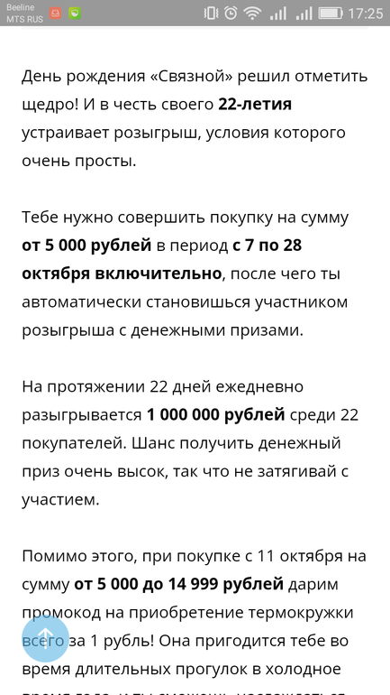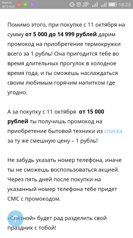 Распродажи, скидки, акции. Фоторепортажи из магазиновДо 22.10 При покупке от 5000 рублей становитесь участником розыгрыша 1 миллиона рублей. Каждый день выбирают 22 человека и среди них делят миллион. Кроме того, дают промокоды на покупку термокружки за 1 рубль при сумме 5000-14999, а свыше 14999 - техники за 1 рубль.