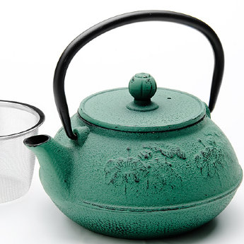 У меня есть чугунный. Мне не очень эстетически симпатично внутреннее металлическое ситечко. Сейчас у меня основной чайник белый фарфоровый, объемом немного меньше литра. Удобно заваривать сразу на двоих (у нас кружки около 350 мл). Чайные листья фильтруются через дырочки перед носиком.