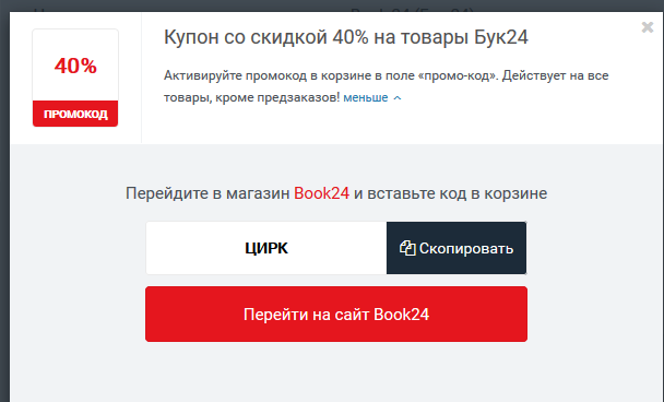 У них какое-то странное "действует на всё", вот на эту книгу не работает https://book24.ru/product/skazki-208018/, со своей везучестью нашла исключение. Они подтвердили, что не на всё действует.