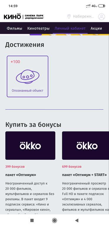 Скидки и акции (для всей семьи)Сегодня обнаружил на сайте kinoteatr.ru в личном кабинете задание "Опознанный объект": за заполнение профиля дают 100 бонусов.