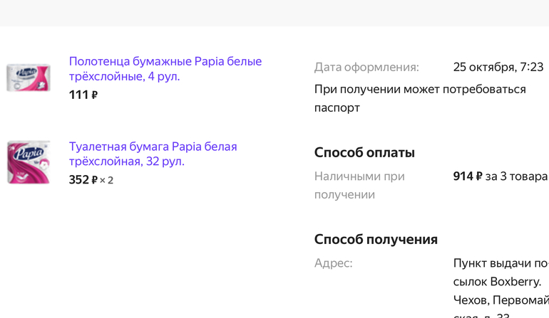 За счет того, что разбил на 2 посылки, то оплачивать их надо по отдельности. Т.е. можно оплатить только бумагу, а второй заказ не оплачивать! Это просто мне нужен гель, а кому не нужен, тот может не брать! И получить бумагу по стоимости 335 рублей за 32 рулона!