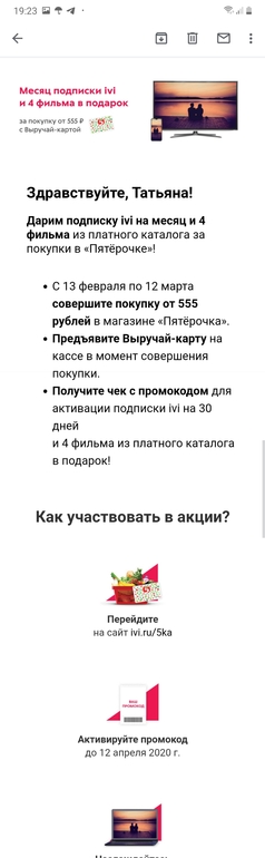 Вот полные правила акции https://5ka.ru/media/documents/ivi30.pdf, действовать по всей России должна. попробуйте с ссылкой на правила и фото чека написать на card@5ka.ru (это мыло для вопросов по акции в письме указали). Может пришлют код.
