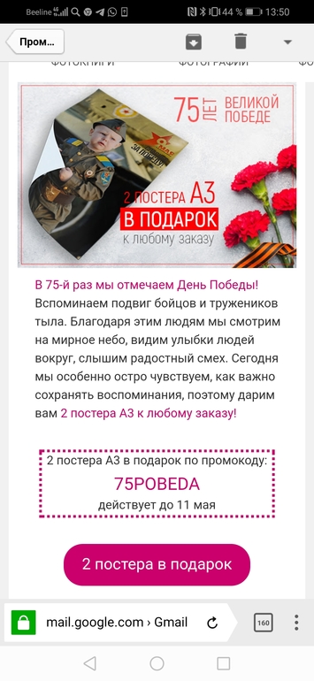 - Положите в корзину любой заказ услуг фотопечати на любую сумму, добавьте к нему 2 постера формата А3, введите промокод, и печать постеров станет для вас бесплатной