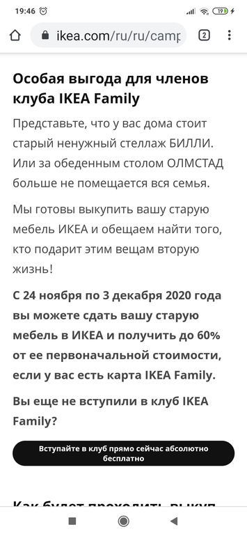Скидки и акции (для всей семьи)Можно сдать старую мебель в ИКЕА, получить на карту возврата деньги.