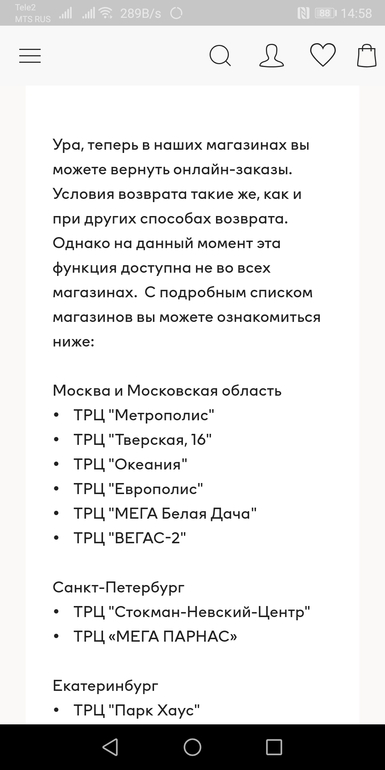 Теперь онлайн заказы можно вернуть через некоторым оффлайн магазины, список магазинов в вашем городе уточняйте на сайте. Условия возврата те же.