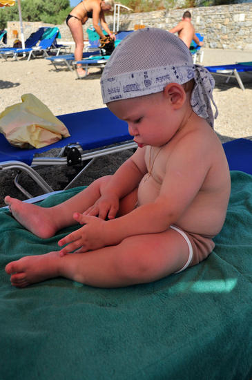 Как Влад заходил в море, слышал весь пляж. Ребенок привык, что в бассейне у него вода теплая, а тут прохладная, да еще это море шумит. Но после минутного привыкания, счастья не было предела. Детишек на пляже было очень много и только один наш со скандалом заходил плавать))