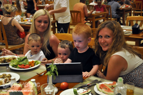 мы познакомились с классными девчонками и их детсками!! и отлично вместе тусили))) и дети тоже))) это как раз просмотр мультов за ужином, иначе их всех не усадить!!!