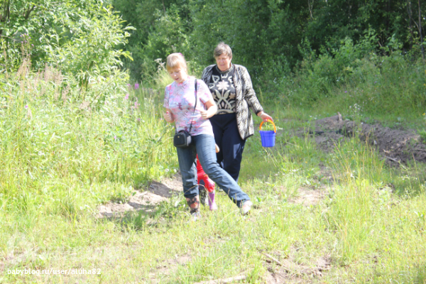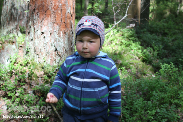 Около леса оделись, намазались всякими штуками от комаров и пошли. Детишкам в лесу очень понравилось. Правда Славеныш мой ягодки сам срывать не хотел, больше нравилось, когда мамочка или бабушка прямо в ротик клали, а вот Дашенька (наша двоюродная сестренка) даже собирала черничку в ведерко вместе со своей мамой.