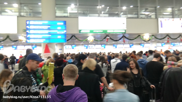 потом оставалось 40 минут до вылета,ждем регистрации и тут рухнул ту ред вингсов.нас задержали еще на неопределенное время...аэропорт закрыли. дали нам паек,гречка и маленькая холодная котлетка.аэропорт отвратный-лавочек мало а народу пресс. в итоге сидели у туалета на тележке для багажа. потом еле как зарегистрировались,еще час проходили паспортный контроль,закупились в дьюти фри.потом пришли уже на посадку.там клетушка маленькая.а рейсов ужас просто сколько.и наш рейс раз перенесли.два перенесли.три перенесли