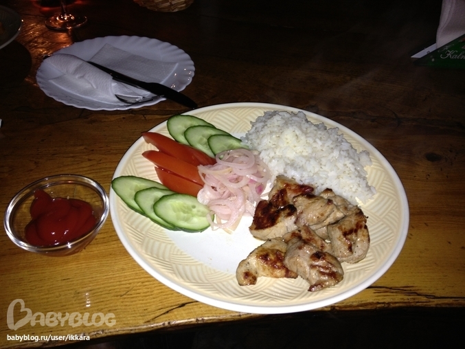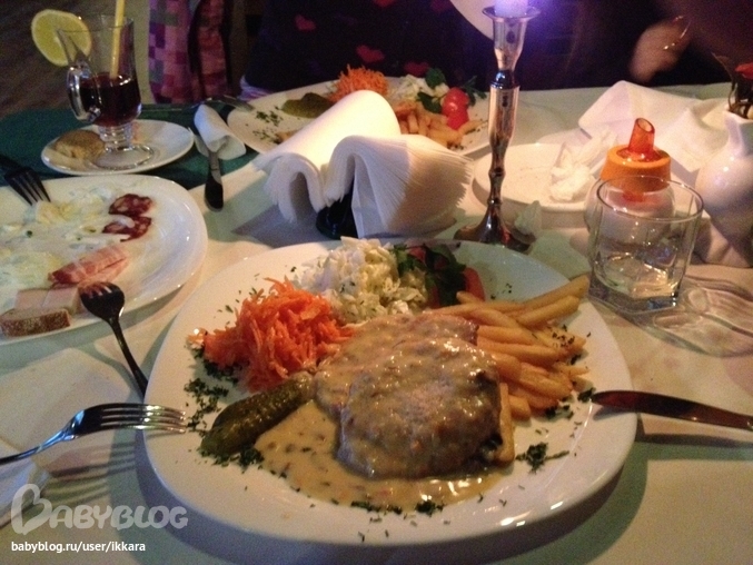 В кафе втроем с пивом-вином-соками-чай-кофе, огромными порциями мяса-рыба - 500-600р., первое блюдо 25-30р., Маша и любимый борщ ниже))