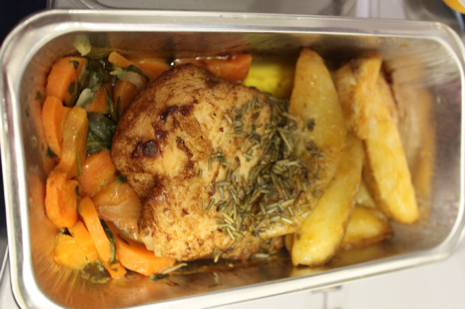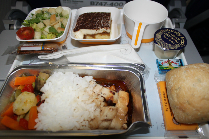 После снеков раздали горячие салфетки и начали разносить ужин...по-началу разносили спец.питание,а потом уже обычное.Питание для малого было куда более вкусным:закуска(курица-гриль,помидорка черри,пюре картофельное),основное блюдо(куриная грудка в панировке,толченка,кукуруза),сок,десерт(ванильный крем с голубикой и фрукты:дыня с клубникой),булочка. Все вполне съедобное...только куриная грудка была суховата и жестковата. У меня с мужем было обычное питание и это было реальное БУЭЭЭЭЭ...салат "Цезарь"(был съедобный), черствая булка не первой свежести и к ней масло с сыром Чедар, пирожное "Тирамису"(съедобное) и горячее...это было реально и МЕГА невкусно:муж взял макароны с томатным соусом(реально только макароны и соус...без капельки сыра и мяска) и без соли!!!При этом соль не давали в маленьких пакетиках,как это принято всегда.Я взяла курицу Тереяки с рисом и овощами...и опять все без соли.В общем, пришлось есть детскую еду,т.к. она была хоть немного соленой и вкусной. Потом разносили чаек и кофеек...еле теплые(((Я горячее не люблю пить,но тут реально еле теплое все было(((После еды малой завалился спать...я и муж тоже пытались это сделать,но уж оч неудобно было.