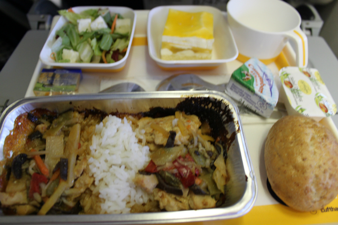 После снеков раздали горячие салфетки и начали разносить еду...ммммммммм)))Малому опять же было спец/меню:на закуску маханькая котлетка с болгарским перцем;на основное было курочка с грибочками в сливочном соусе и рис; десерт-рулетик с кремом,шоколадный крем;апельсиновый сок и булочка.Все опробовали.Все было вкусно...особенно котлетка)))Нам дали опять же "Цезарь";основное блюдо состояло из курицы,риса и овощей в индийском стиле(признаться честно,толи мы были голодные,толи это действительно было вкусно),нежнейшее и вкуснейшее манговое пирожное;булочка,масло и сыр Камамбер.Все было вкусно...хотя соль опять не дали и напоили холодным чаем.После обеда мы залегли спать.Благодаря этому полет прошел незаметно.Стюардессы постоянно ходили по салону и разносили воду и сок.Некоторые умудрялись пить спиртное(((Девочки!А на российских рейсах спиртное у Люфганзы тоже безлимитное?