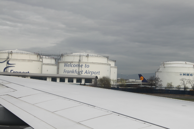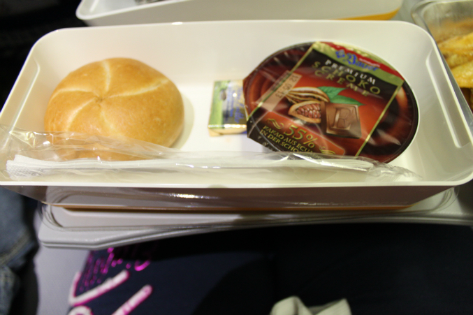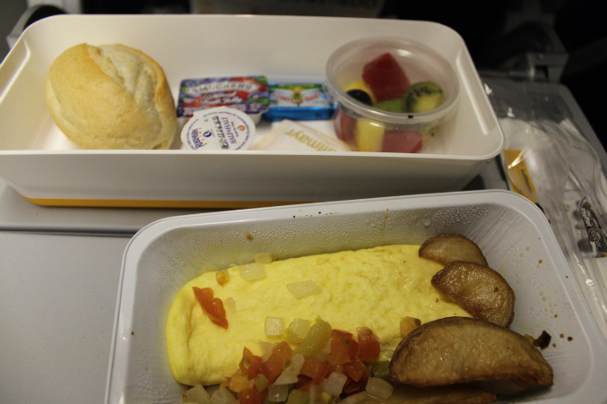 За 2,5 часа до прилета во Франкфурт у нас был завтрак...опять МЕГА отвратный:безвкусный омлет с картошкой и смесью из лука и перца(((Ладно хоть соль дали!+булочка,масло,джем и фрукты.В общем, еда не порадовала.Американские повара в пролете(((