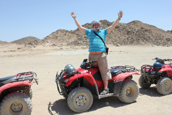 Следующая наша экскурсия состоялась по пустыне. А точнее мы вдвоем (подружка моя осталась с детишками) отправились на Сафари. А точнее катание по пустыне на квадрациклах.... Еще вечером перед этой поездкой я начала как-то волноваться. Думать о квадрике. Я ведь никогда за ним не сидела. А с утра я вообще почувствовала себя не очень хорошо. Буквально до этого я хорошо поджарилась на солнышке, хотя специально я в этом году вообще не загорала и мне было как-то не по себе.... А может просто мандраж..... В результате, когда нас привезли в пустыню, к гаражам с квадрациклами, моего желания ехать самой становилось все меньше и меньше.... Нам завязали платки и девушка начала объяснять, как пользоваться этими квадриками..... Я конечно все внимательно слушала, но вопросов была куча..... И тут в конце она говорит, что кто не хочет ехать самостоятельно, может ехать за своими мужьями, молодыми людьми или просто за гидами и помощниками. Я так обрадовалась.... Нас провели к квадрациклам, я села за мужем. Ик слову я была не одна такая. Какие-то девушки сели самостоятельно. Но на проверочном круге нескольким их них не разрешили управлять квадрациклами самостоятельно. Кто-то потом сошел по пути и их рассаживали по-другим машинам....