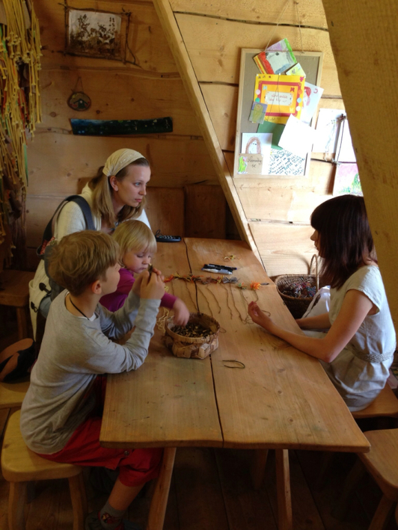 Потом смело идите на улицу и исследуйте окрестности. Мы нашли чудесную избушку, где пекут блины. Пока ждали блины, Маша прилегла поспать за печкой - так и сказала нам: "Маня бай-бай" и сделала ручкой. Единственная проблема - в этой блинной не говорят ни на русском, ни на английском, а только на каком-то эстонском диалекте. Муж ткнул пальцем в меню наугад и попросил два блина. К блинам принесли что-то в стаканах. Первое типа кефира, но намного вкуснее, второе типа творожной массы с вареньем, третье мюсли с йогуртом. Мы умяли все очень быстро. Блины оказались такими вкусными, что пришлось заказать еще два, а потом еще один. Заплатили 8,50 евро и довольные пошли дальше. По дороге собирали и ели землянику, ее там очень много, поки ведь в лесу живут :) Покатались на качелях, зашли в баню, были покусаны комарами, но даже они не испортили удовольствие, полученное от этого волшебного места.