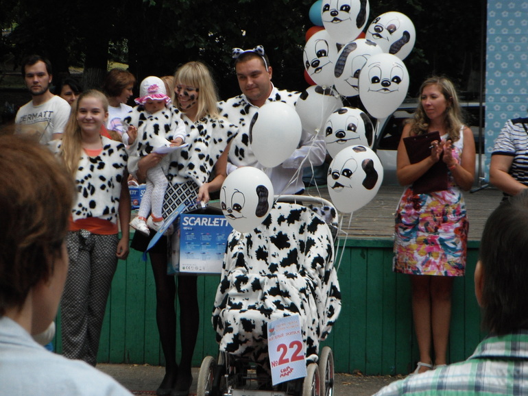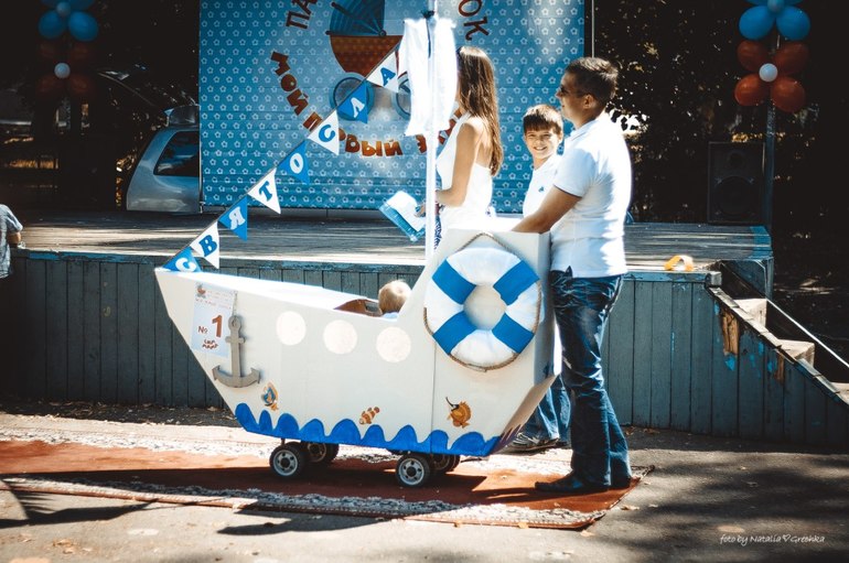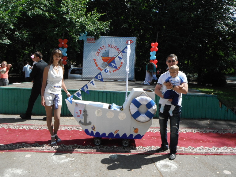 Готовились мы целый месяц. Тематика была выбрана морской, номинация:Транспорт. Не случайно тема морская нас увлекла, т.к. 30 июля у нас ДР, годовасие. Атрибутика, я решила будет одинаковой и там и там, и не нужно два раза рукодельничать. Наш корабль был самым большим из всех присутствующих на параде кораблей, да и самым многодетальным, я бы сказала даже)))Мы заняли 4 место, наш приз-сертификат на изготовление слепка ручки и ножки ребенка меня очень даже устроил, т.к. за первое место приз мультиварка-у меня уже есть, второе место-напольный вентилятор-тоже имеется, третье место-упаковка памперсов, у меня их две, а вот, слепка-не было.Но, обидно другое: первые три места, в некоторых номинациях, заняли те, кто приложил минимум труда.Ну, например семья далматинцев, в номинации "Фильм".Купить кусок ткани, разрезать на части и накинуть на шею-особого труда не составит, а вот собрать корабль и все аксессуары руками-не быстрый процесс.Да и другие корабли, были похуже нас, но заняли призовые места.Ну, да ладно.Все равно все было очень здорово и весело.Фото прилагается: первый корабль Святослав - наш.Первое фото-нас этот кораблик обошел, в нашей номинации 3 место, мы, как оказалось хуже)))))Все победители по ссылке: http://simmama.ru/frm/pozdravlyaem-pobeditelei-parada-kolyasok