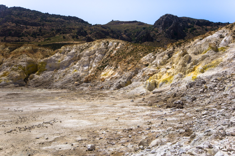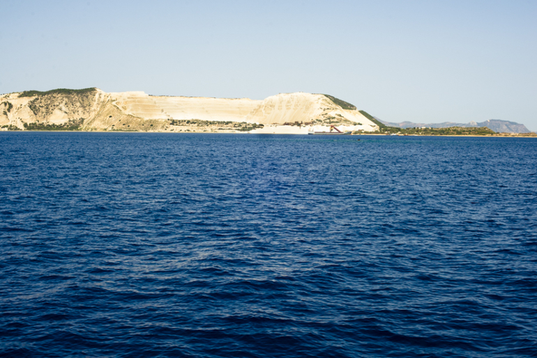 Проплываем мимо крошеяного острова Ялли. На нем добывают пемзу (светлое на фото - карьер) и обсидиан.