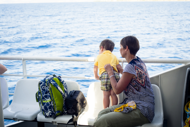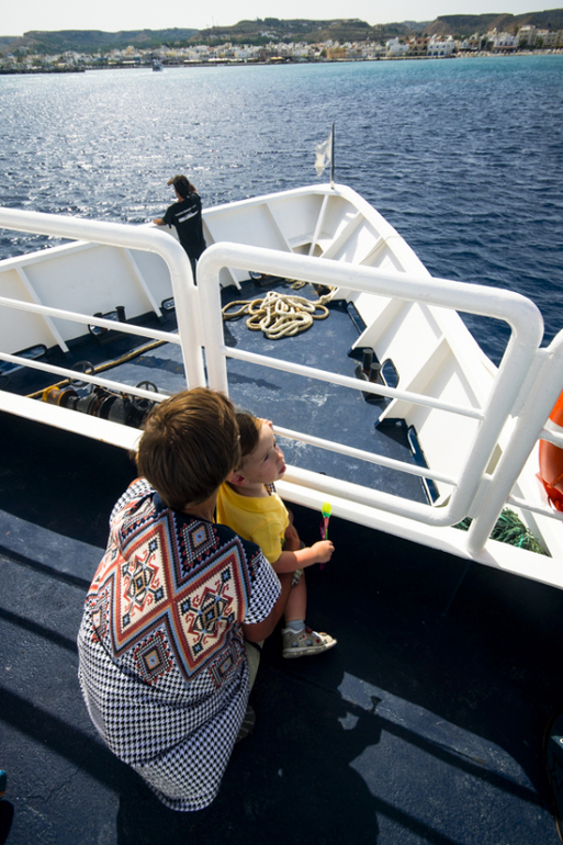 Паромы от Коса уходят из порта Кардамены. Время в пути - 50 минут. Наш паром был большим. Не видела, чтобы кого-то укачало. Мишка с интересом смотрел по сторонам всю дорогу.