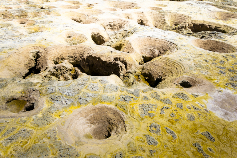 Дырки в земле - фумаролы. Из них поднимается вонючий пар. Его не видно на фото из-за яркого солнца. Земля под ногами около фумарол отчетливо горячая, людям в обуви на тонкой подошве там было некомфортно.