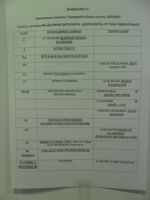 Когда мы собрали все документы и их копии, то к назначенному дню и времени отправились в консульство. Очередь очень маленькая, но почти все исправляют анкету, или бегут делать копии. Об анкете: вот что висит на стене у окошка
