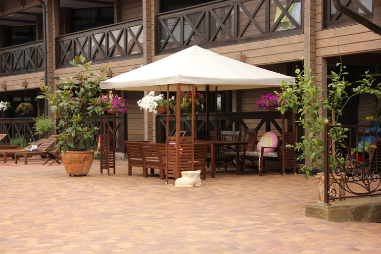 На территории есть две больших беседки и мангал, его можно арендовать или заказать шашлык у них. Беседки располагаются по обе стороны бассейна. В них очень удобно отдыхать, так же мы там и рисовали и книги читали. Вот одна из них
