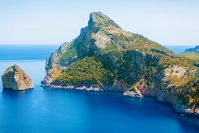Мыс Форментор - красивейшая достопримечательность Майорки, окруженная соснами, величественными утесами, бескрайним морем, синие волны которого с неистовой силой бьются о скалы, бескрайним небом. Со смотровой площадки открывается сногсшибательный вид на властные горы, бесконечные просторы моря и остров Коломер.