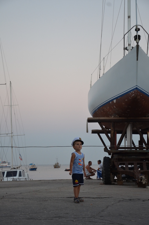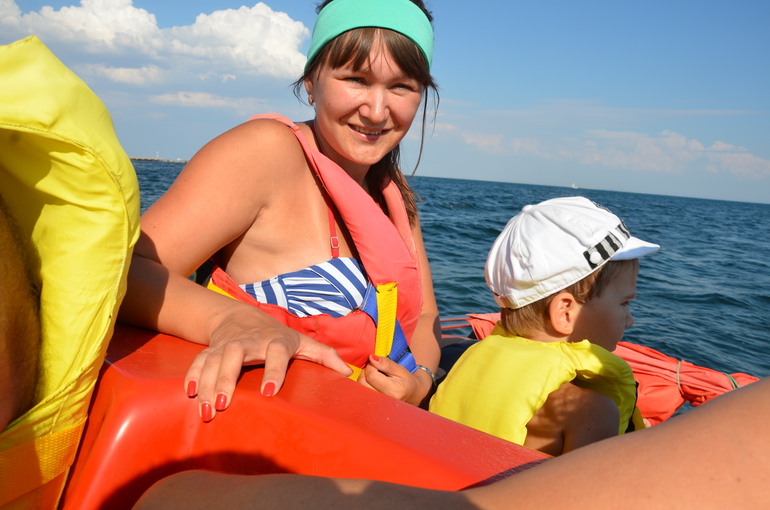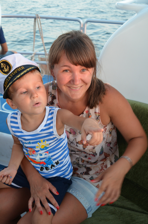Рискнули прокатиться втроем на катамаране, пока бабушка не видит, а то бы она запричетала, заохала, куда мы с таким маленьким...ит.д. И не ошиблись! Диме очень понравилось наше часовое путешествие по морю, просился еще! В море Дима искал и считал чаек, катера, теплоходы, парусники...