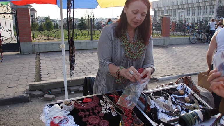 Впервые к нам приехали мастера из других регионов. Очень меня впечатлили работы Татьяны Солдатенко из Минска, она делает потрясающие украшения из кожи с натуральными камнями. Вот здесь можно прикоснуться к рукотворной красоте.